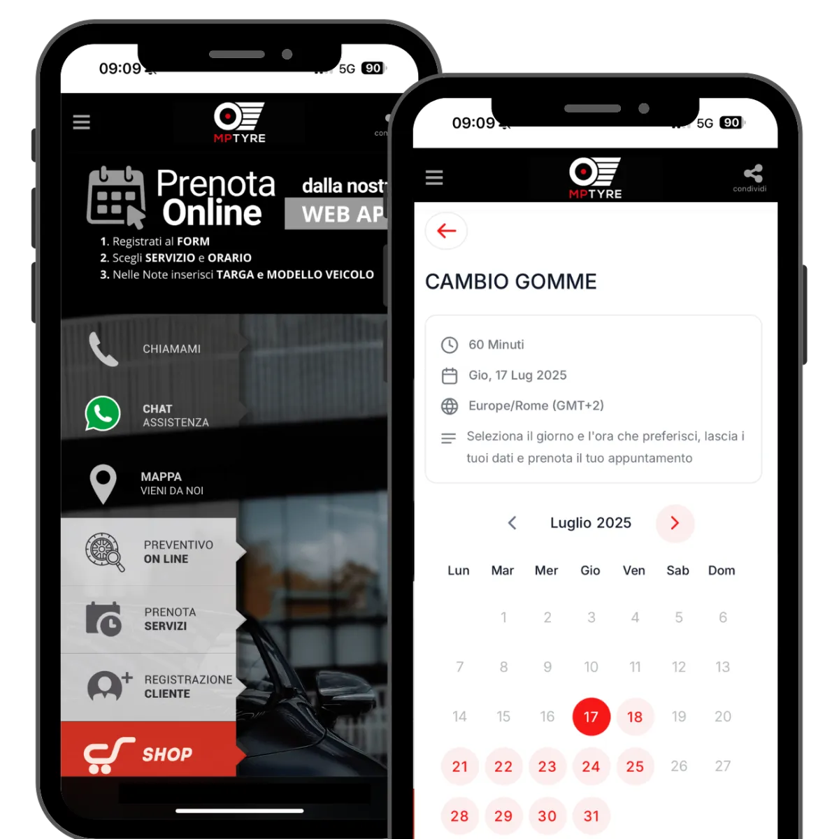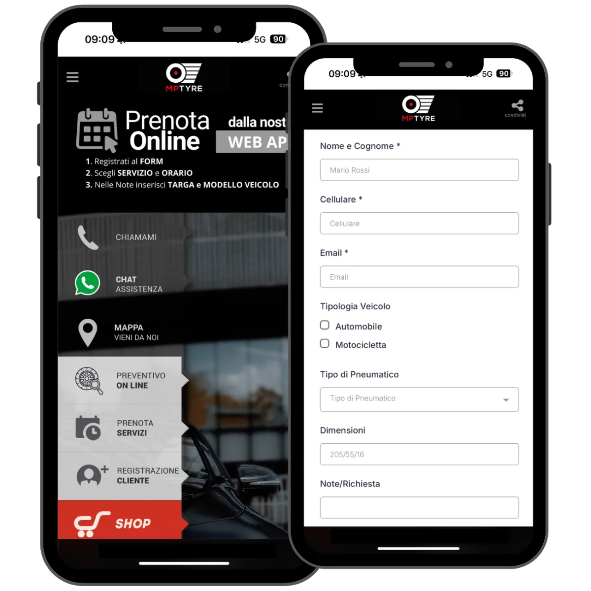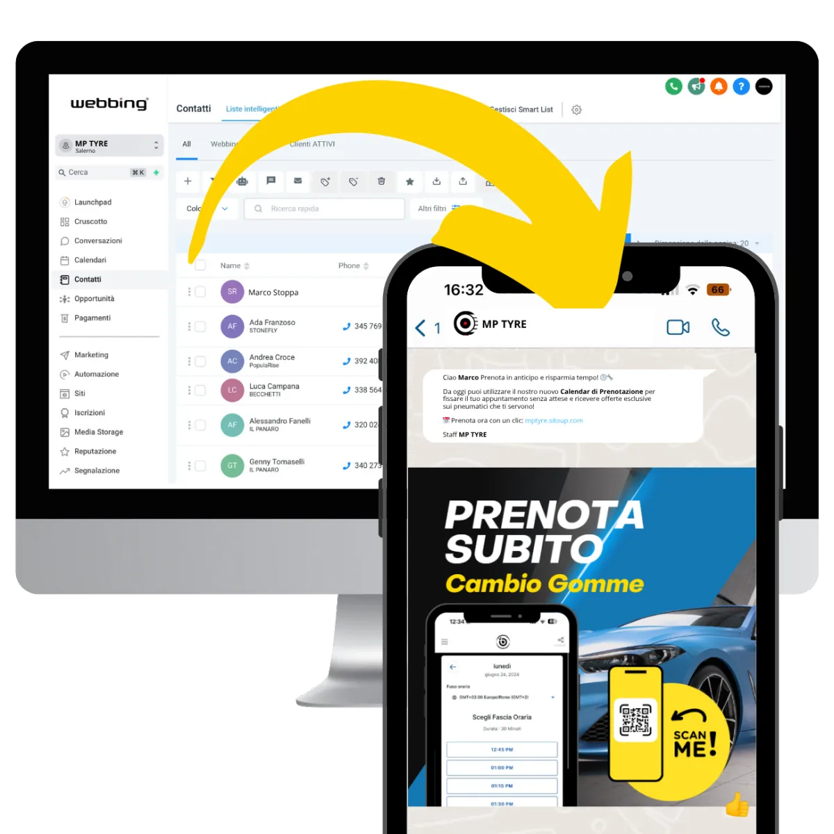 La nuova Web App integrata al CRM per Gommisti è uno strumento pratico e intuitivo che semplifica ogni aspetto della gestione clienti. Grazie a un’interfaccia rapida e personalizzabile, permette di ricevere Contatti Diretti, Prenotazioni Online, aumentare Recensioni e Followers.