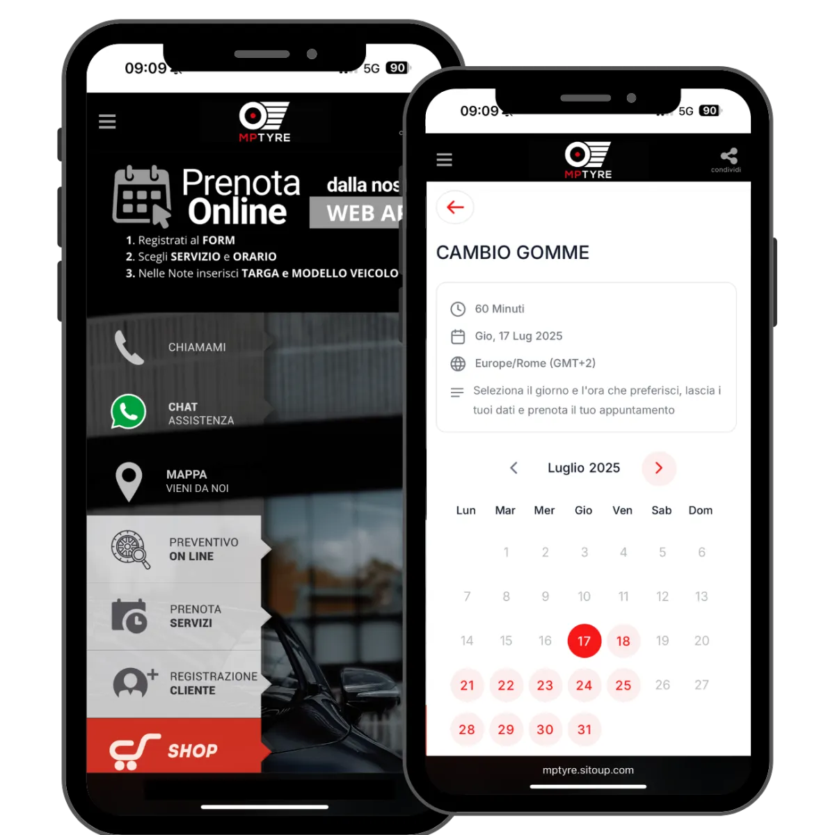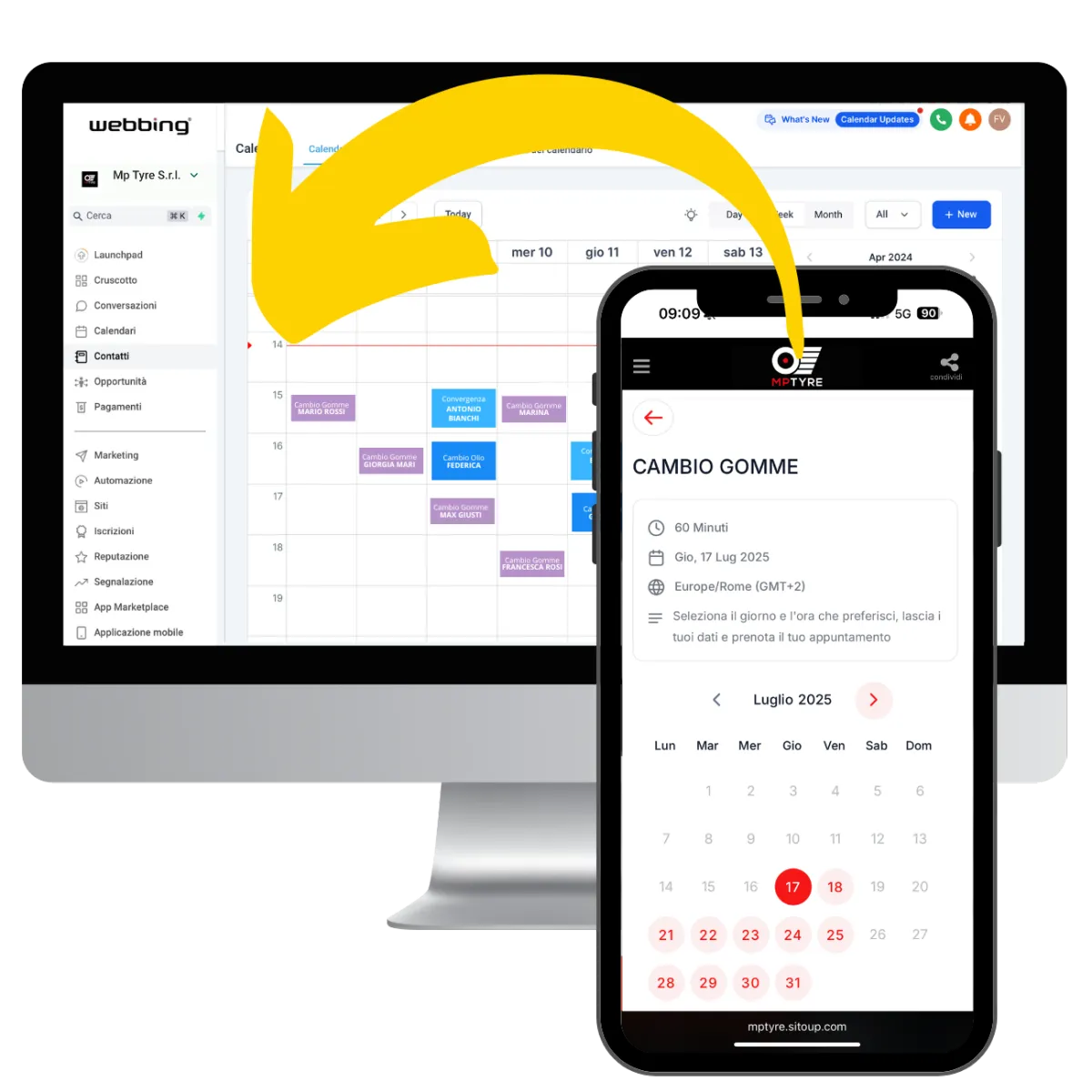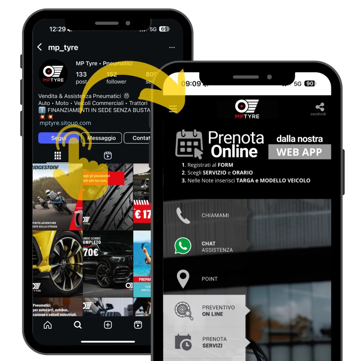 La nuova Web App integrata al CRM per Gommisti è uno strumento pratico e intuitivo che semplifica ogni aspetto della gestione clienti. Grazie a un’interfaccia rapida e personalizzabile, permette di ricevere Contatti Diretti, Prenotazioni Online, aumentare Recensioni e Followers.