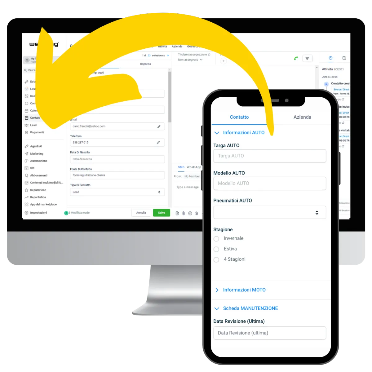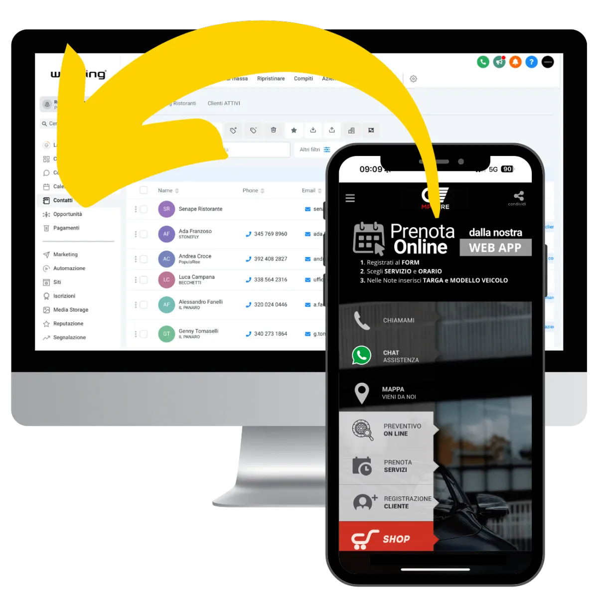 Il nostro CRM è lo strumento gestionale perfetto per chi lavora in officina: ti permette di gestire ogni cliente con precisione, pianificare gli interventi, ricevere prenotazioni online o telefoniche, inviare promemoria automatici via WhatsApp o Email, e fare marketing in modo semplice per aumentare le Recensioni e la visibilità sui Social.