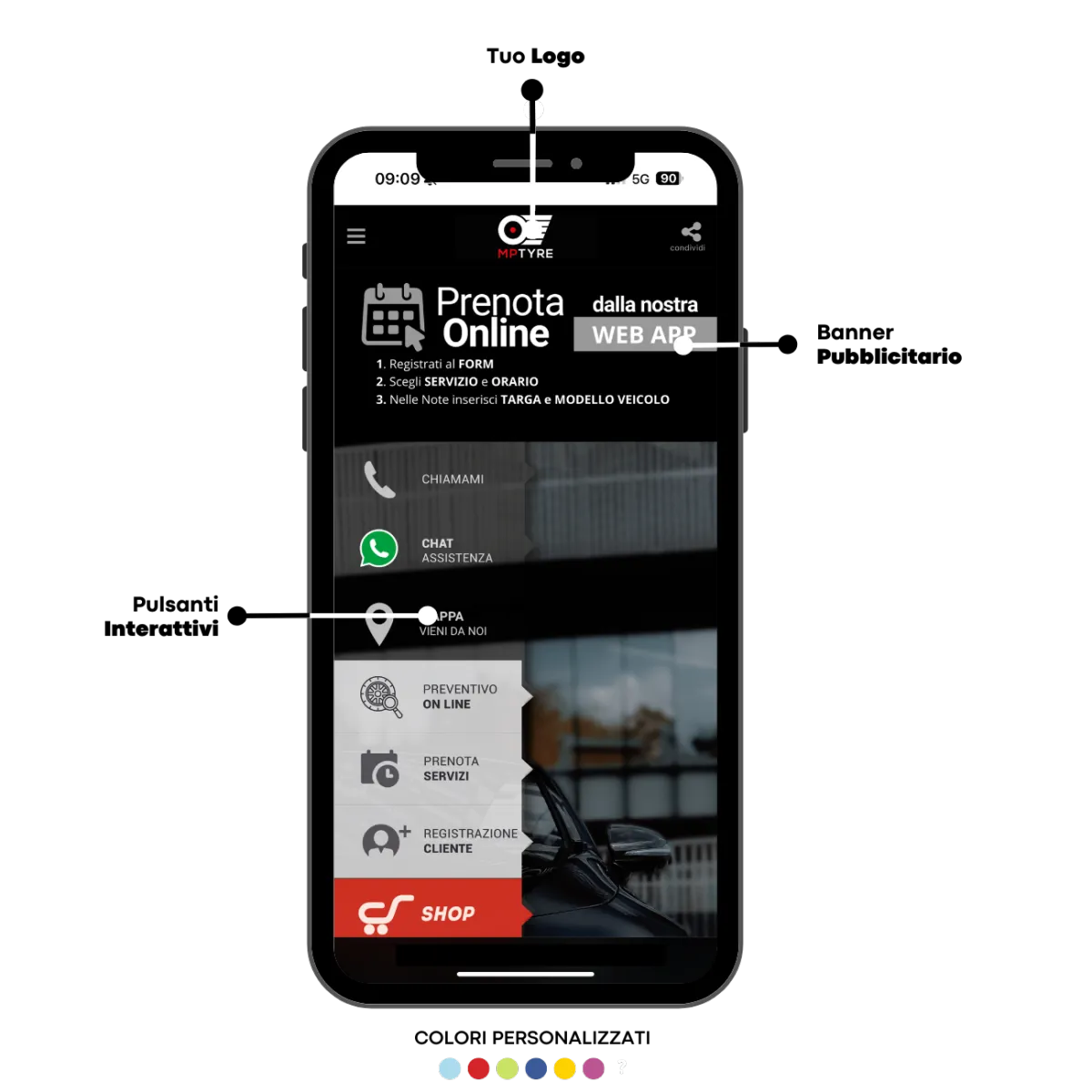 La Web App è la tua innovativa interfaccia mobile per i clienti, che permette di contattarti in maniera veloce (Click to Call e Chat), raggiungere l'officina attraverso la Mappa Interattiva, prenotare i tuoi servizi online attraverso il Calendar, richiedere un Preventivo attraverso un form interattivo, acquistare prodotti con il tuo nuovissimo Shop Mobile, seguire le tue pagine Social o fare una Recensione veloce su Google, e tanto altro ancora.