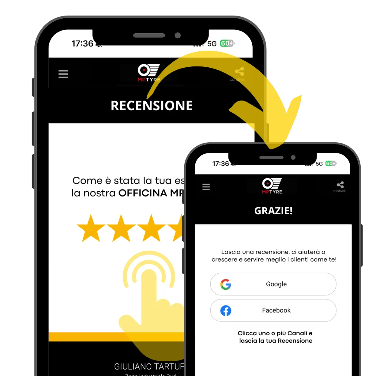 Il modulo Recensioni Positive integrato nella Web App è pensato per aiutare i gommisti a raccogliere più feedback positivi in modo semplice e automatizzato.