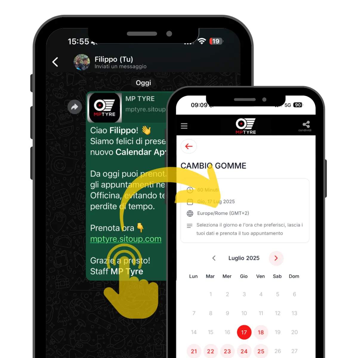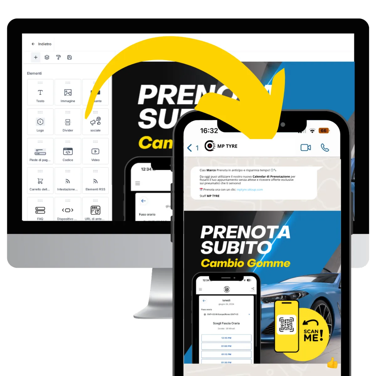 La Web App del pacchetto GommistaUp è pensata per essere condivisa in modo immediato e strategico: grazie al link unico, facilmente inviabile via WhatsApp, Stories o Post Social, ma anche tramite QR Code stampato, ogni officina può promuovere il proprio Calendar di Prenotazione e la propria vetrina mobile in ogni momento.